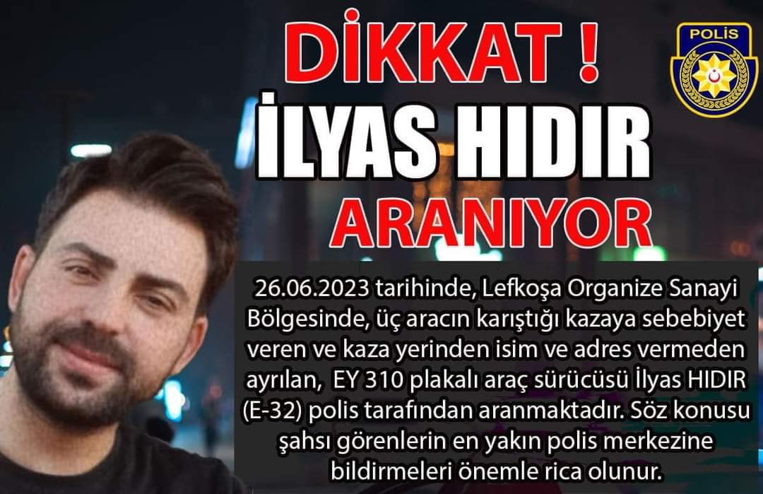 Lefkoşa’nın Organize Sanayi Bölgesi’nde 26 Haziran tarihinde üç aracın karıştığı kazaya sebebiyet veren ve kaza yerinden kaçan İlyas Hıdır her yerde aranıyor. Polis Genel Müdürlüğü İlyas Hıdır’ın aran...
