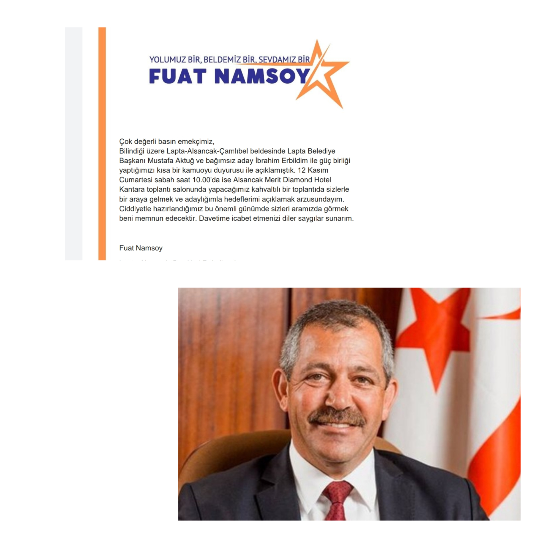 Lapta-Alsancak-Çamlıbel Belediyesi Bağımsız Belediye Başkan Adayı Fuat Namsoy, yarın sabah Alsancak Merit Diamond Hotel Kantara toplantı salonunda kahvaltılı basın toplantısı gerçekleştirecek. Başkan ...