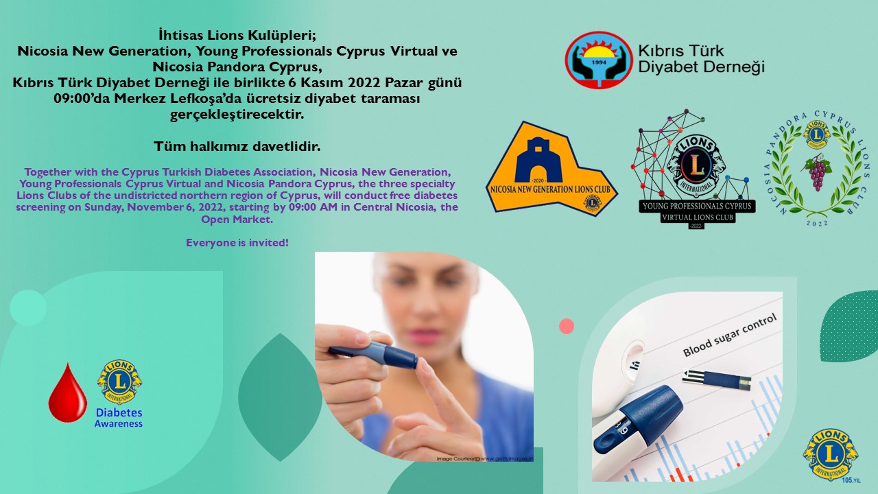 İhtisas Lions Kulüpleri Nicosia New Generation, Young Professionals Cyprus Virtual ve Nicosia Pandora Cyprus Kulüpleri, tarafından pazar günü ücretsiz şeker taraması yapılacak. Kıbrıs Türk Diyabet Der...