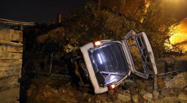 Evin bahçesine giren minibüs devrildi