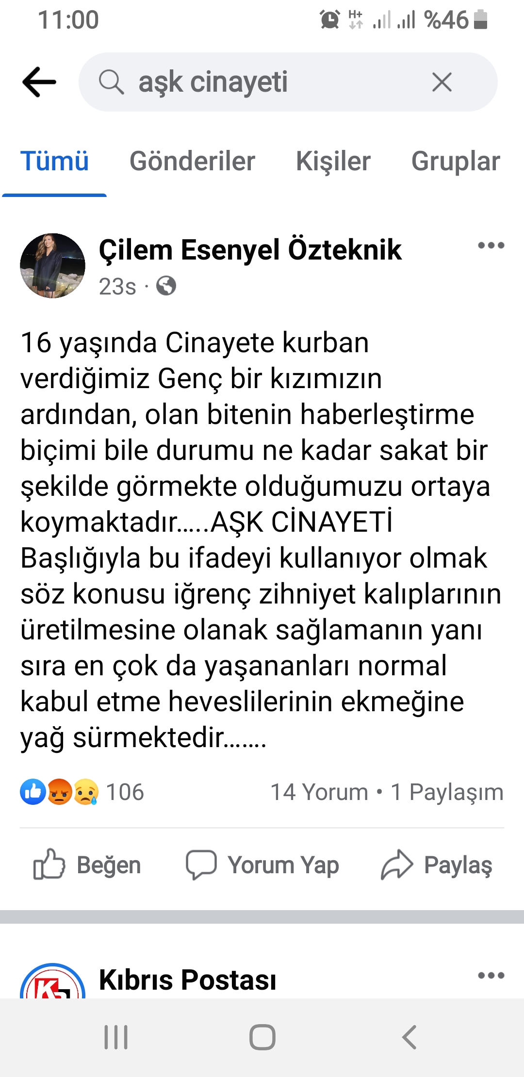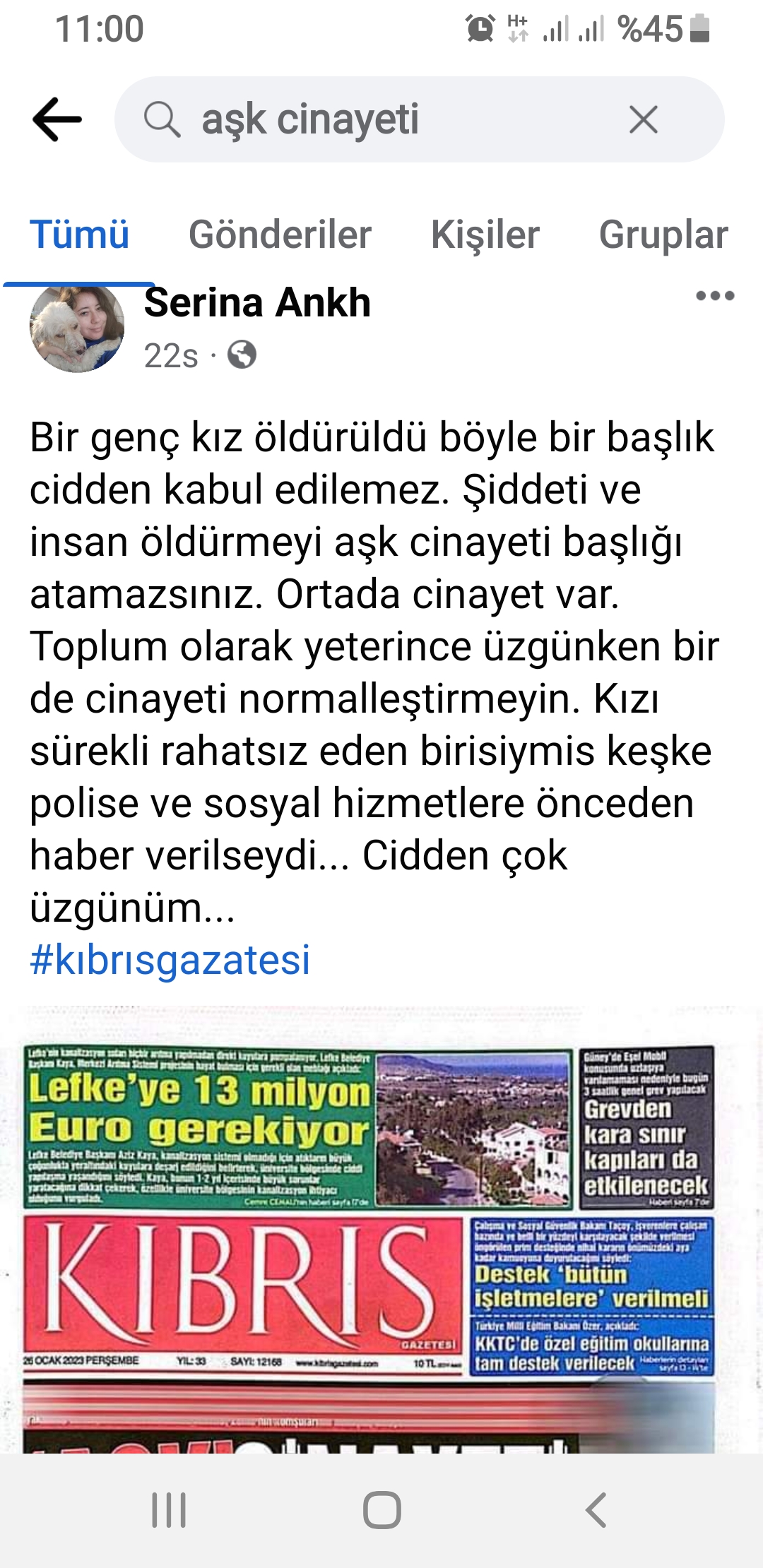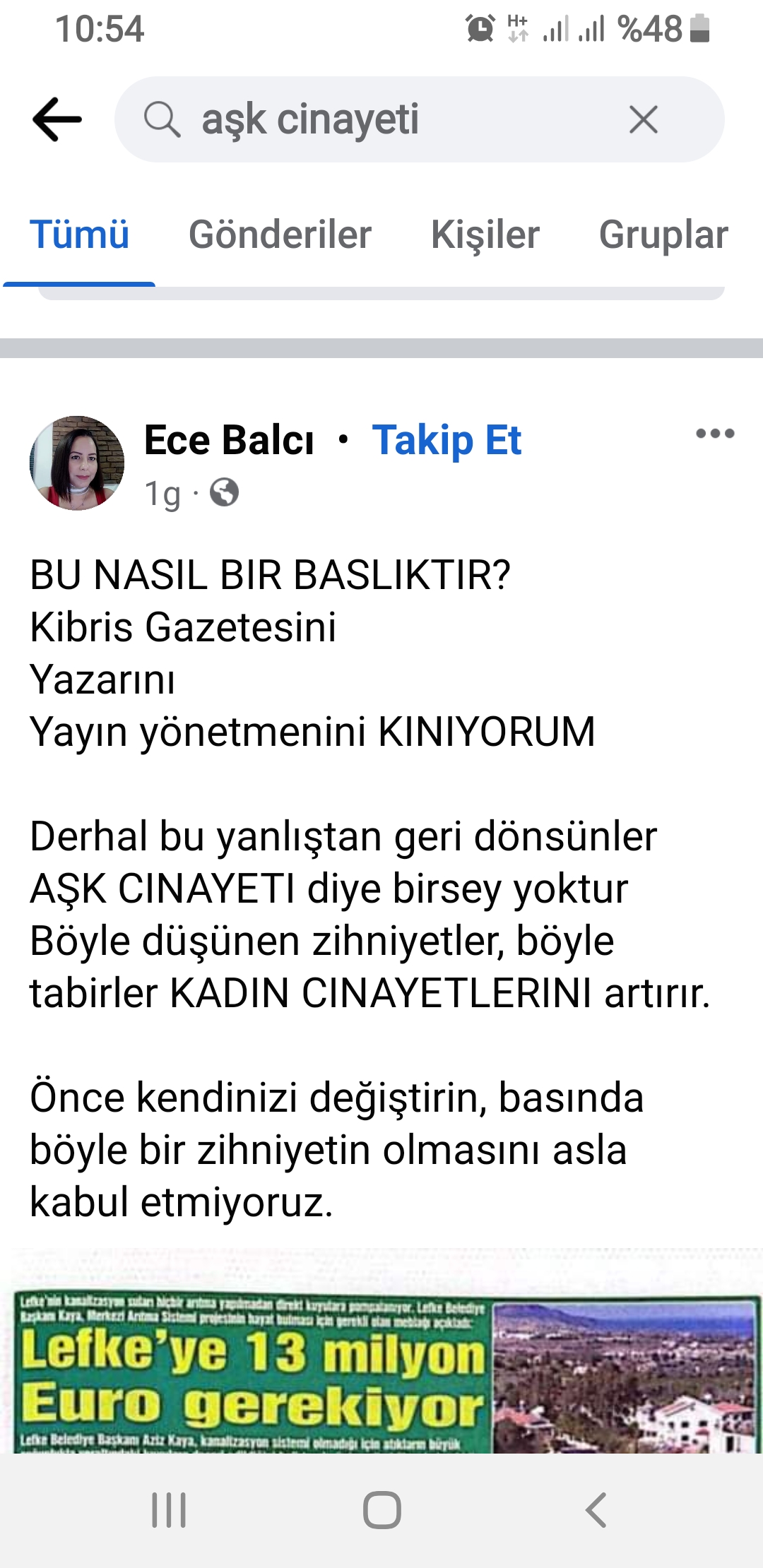 Milletvekillerinden tutun da siyasi parti ve sivil toplum örgütlerinin kınadığı 16 yaşındayken bir erkek tarafından öldürülen Helin Reessur cinayetiyle ilgili “Aşk Cinayeti” manşeti atan Özer Kanlı‘nın Genel Yayın Yönetmenliğindeki Kıbrıs Gazetesi‘ne vatandaşlardan da ciddi bir tepki geldi.